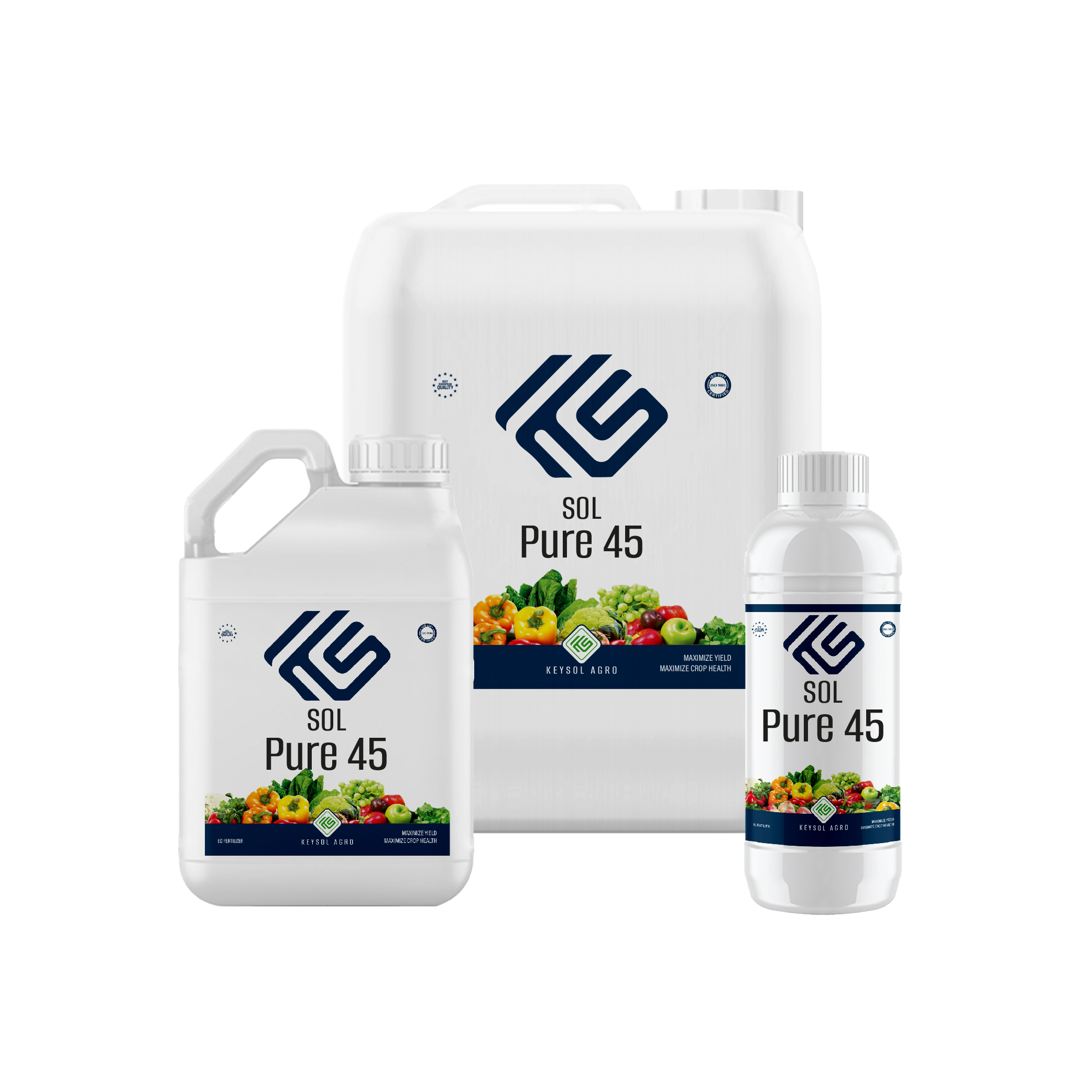 Sol Pure 45 is a concentrated organic liquid plant nutrition preparation that is derived from various plants by means of advanced technology. Sol Pure 45 is a sterilized and condensed product that is obtained as an output of enzymatic reactions. It contains a high rate of vitamins, organic nitrogen, various micro and macro elements, and natural hormones. In addition, it provides enzymes, vitamins, and proteins that are required by every living organism.